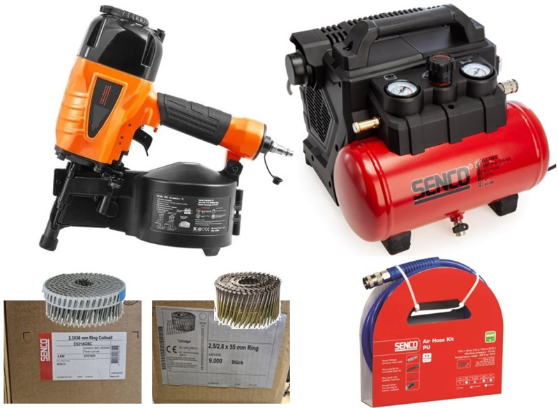 SUPERDEAL: Senco compressor + luchtslang + coilnailer + nagels RVS en gegalvaniseerdSPECIALE SUPERDEAL: